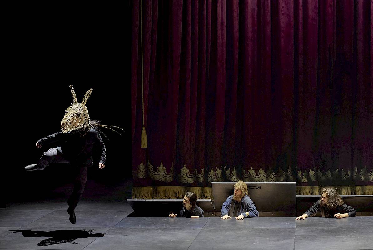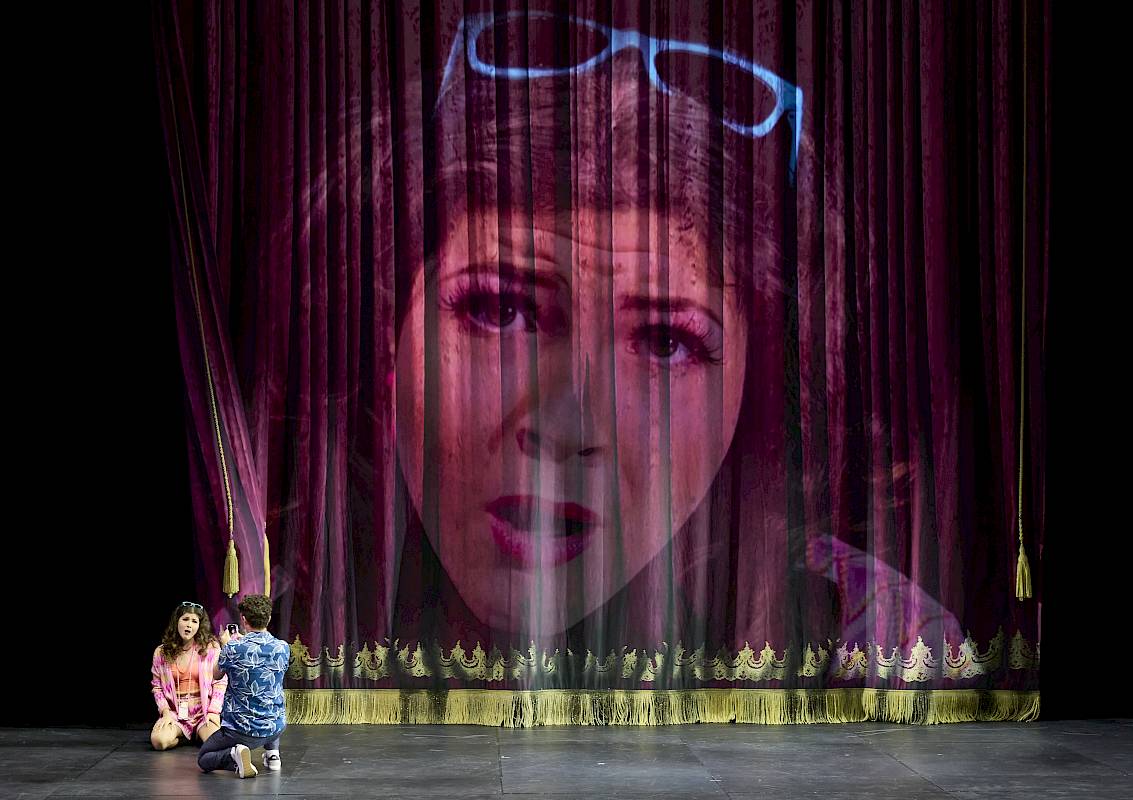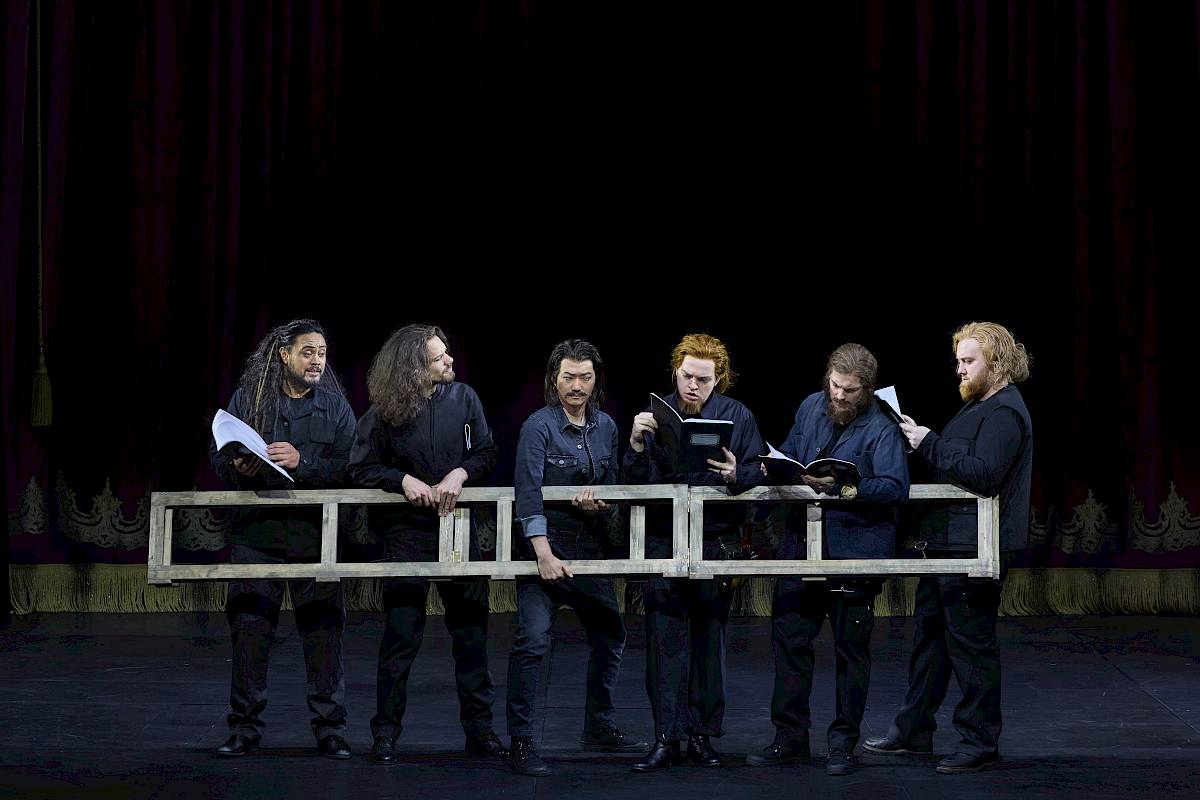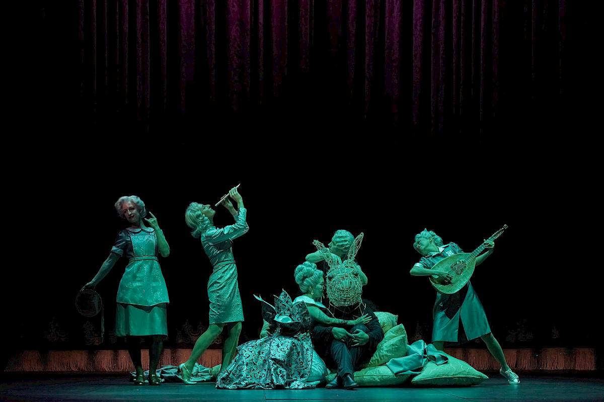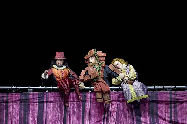 Wir wollten nicht nur den leeren Raum zeigen und haben uns deshalb für einen Vorhang als Bühnenelement entschieden, der bei uns dank einer komplexen Mechanik sehr vielseitig eingesetzt und bespielt werden kann. Die verschiedenen Figurengruppen, die bei Shakespeare auch unterschiedliche Sprachstile und bei Britten verschiedene Klangwelten haben, sind in unserer Inszenierung auch ästhetisch von verschiedenen Spiel- und Kostüm- bzw. Kleidungsstilen geprägt, die wir aus dem Theater kennen. Oberon und Tytania – die hier übrigens nicht von Elfenkindern, sondern von einer Schar weiblicher Bediensteten begleitet wird – sind auch optisch von der Welt der barocken Oper inspiriert. Die sechs Handwerker sind Bühnentechniker, die im Theater arbeiten. Und die vier Liebenden sowie das Herrscherpaar Theseus und Hippolyta sind Darstellerinnen und Darsteller von heute. Die Schauspieler sind ja auch zu Shakespeares Zeit in zeitgenössischen Kleidern aufgetreten. Das wiederum hat uns dazu inspiriert, das «Pyramus und Thisbe»-Stück, das die Handwerker aufführen, als Puppenspiel zu zeigen, das ästhetisch eine Reverenz an das Zeitalter Shakespeares ist. Die Form des Puppentheaters unterstreicht ausserdem noch einmal den ganzen Aspekt des Spiels, den Shakespeare in diesem Stück so stark betont: Als Zuschauer sieht man beim Puppenspiel immer den Vorgang des Puppenspiels – und vergisst diesen zugleich, wenn man sich ganz der Illusion der belebten Puppe hingibt.