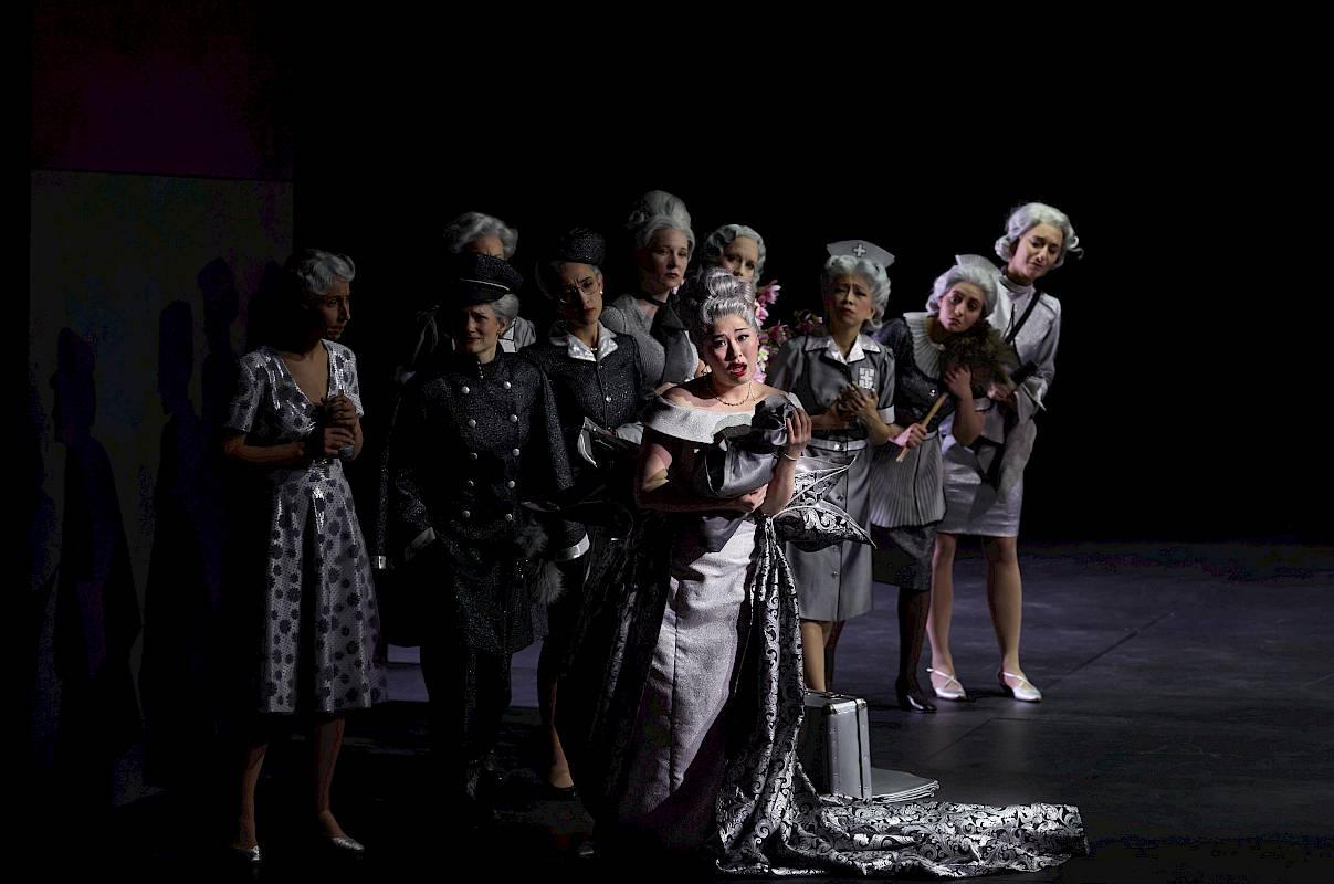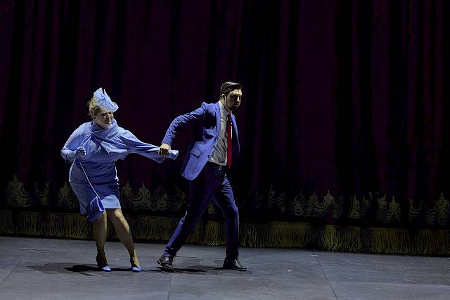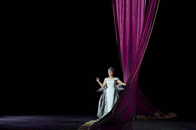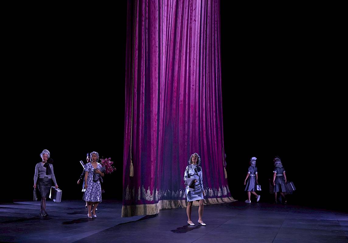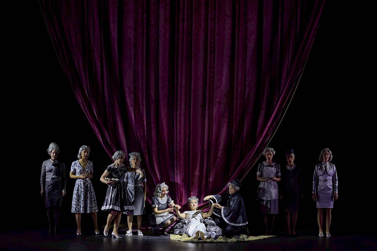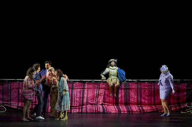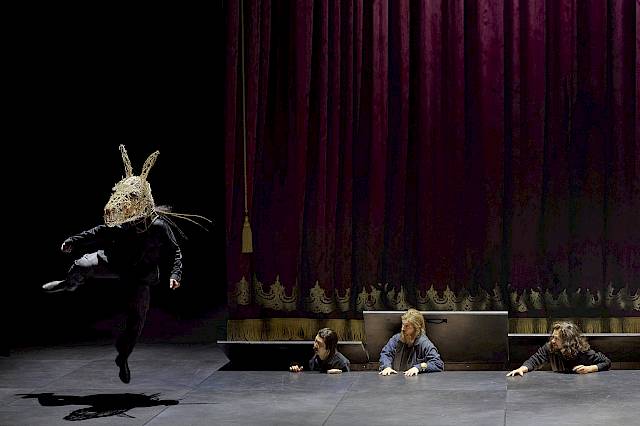 Wir wollten nicht nur den leeren Raum zeigen und haben uns deshalb für einen Vorhang als Bühnenelement entschieden, der bei uns dank einer komplexen Mechanik sehr vielseitig eingesetzt und bespielt werden kann. Die verschiedenen Figurengruppen, die bei Shakespeare auch unterschiedliche Sprachstile und bei Britten verschiedene Klangwelten haben, sind in unserer Inszenierung auch ästhetisch von verschiedenen Spiel- und Kostüm- bzw. Kleidungsstilen geprägt, die wir aus dem Theater kennen. Oberon und Tytania – die hier übrigens nicht von Elfenkindern, sondern von einer Schar weiblicher Bediensteten begleitet wird – sind auch optisch von der Welt der barocken Oper inspiriert. Die sechs Handwerker sind Bühnentechniker, die im Theater arbeiten. Und die vier Liebenden sowie das Herrscherpaar Theseus und Hippolyta sind Darstellerinnen und Darsteller von heute. Die Schauspieler sind ja auch zu Shakespeares Zeit in zeitgenössischen Kleidern aufgetreten. Das wiederum hat uns dazu inspiriert, das «Pyramus und Thisbe»-Stück, das die Handwerker aufführen, als Puppenspiel zu zeigen, das ästhetisch eine Reverenz an das Zeitalter Shakespeares ist. Die Form des Puppentheaters unterstreicht ausserdem noch einmal den ganzen Aspekt des Spiels, den Shakespeare in diesem Stück so stark betont: Als Zuschauer sieht man beim Puppenspiel immer den Vorgang des Puppenspiels – und vergisst diesen zugleich, wenn man sich ganz der Illusion der belebten Puppe hingibt.