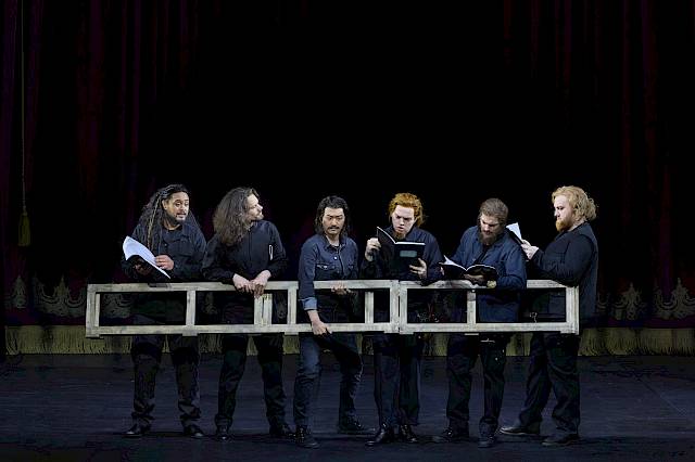 Fotograf Michael Sieber hat die theaterbegeisterten Handwerker auf der Probebühne in Szene gesetzt. Das ganze Bild ist im MAG 111 abgedruckt.