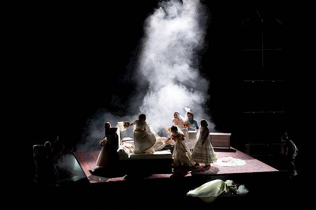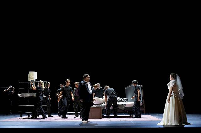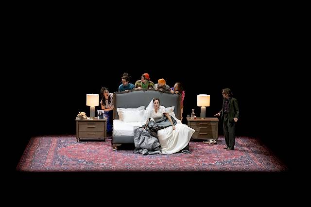 Die Oper beginnt auf einer leeren, schwarz eingefassten Bühne als Blick hinter die Kulissen einer Theatervorstellung: Bühnentechnikerinnen und -techniker kommen herein, rollen einen Teppich aus, ein Bett wird darauf gestellt, zwei Nachttische mit Lampen – ein einfaches Bild. Doch Michael Levine zeigt: Manchmal braucht es nicht viel, um ein tolles Bühnenbild zu schaffen. Irgendwann nämlich hebt der Teppich ab: Er scheint zu fliegen, neigt sich zur Seite, schwenkt vor und zurück und dreht samt Bett und singendem Ensemble. Alles kommt in Schräglage, die Lampen fallen von den Nachttischen, das Bettzeug gerät ins Rutschen, die Schlafzimmereinrichtung droht vom fliegenden Teppich zu stürzen. Technisch ist das spannend, aber noch nicht spektakulär: Der Teppich liegt auf einer im Boden eingelassenen Plattform, deren Hub- und Kippbewegungen wir mit unseren Podien steuern. Für die Drehung haben wir den Drehantrieb eines Baggers eingebaut, der funktioniert auch als fliegender Teppich richtig gut.