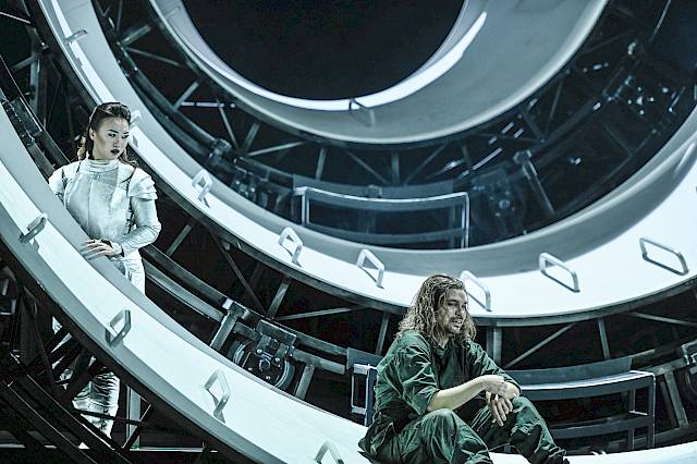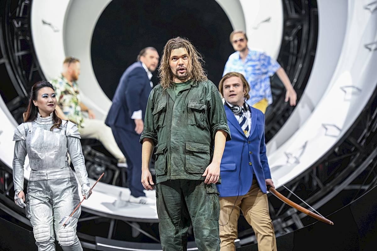 Leonard Evers: Musikalisch war es grundsätzlich mein Ziel, für jede Insel ein eigenes klangliches Idiom zu finden. Demgegenüber stand aber tatsächlich auch die Herausforderung, einiges an Text unterzubringen, weil es natürlich Handlung gibt, die erzählt werden soll. Die Szene bei Kalypso steht ganz am Ende der Reise und ist deshalb besonders wichtig: Odysseus hat in dieser Szene nicht nur sein Schiff und seine Gefährten verloren, sondern in gewisser Weise auch sich selbst. Gleichzeitig befindet er sich in den Armen einer wunderschönen Frau, was offensichtlich dazu führt, dass er sieben Jahre lang die Zeit vergisst. Was Odysseus hier erlebt, ist das Paradies, und doch ist es das absolute Gegenteil von der Heimat, die er eigentlich sucht: Bei Kalypso findet er eine objektiv perfekte, aber völlig unwirkliche Welt. Ich habe deshalb eine Art «Liftmusik» geschrieben, die eine schöne, aber völlig sterile und unpersönliche Atmosphäre verbreitet.