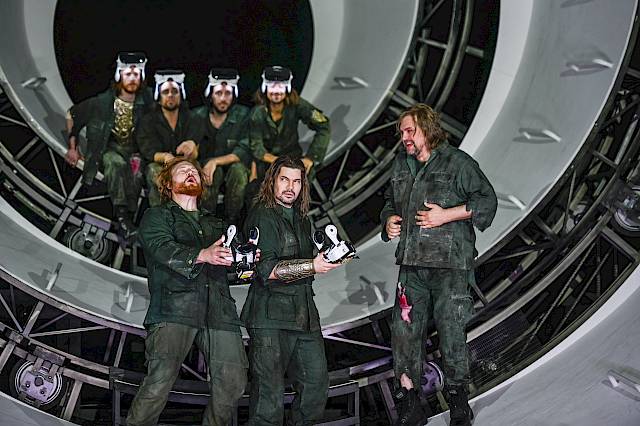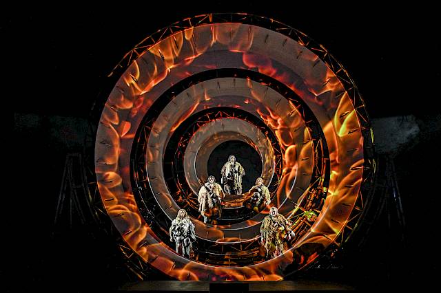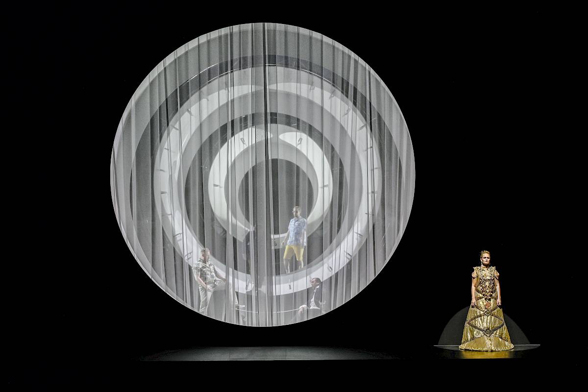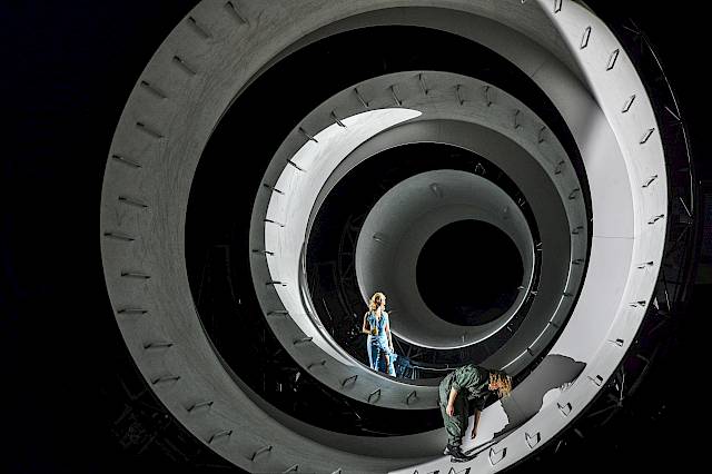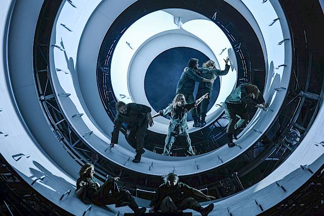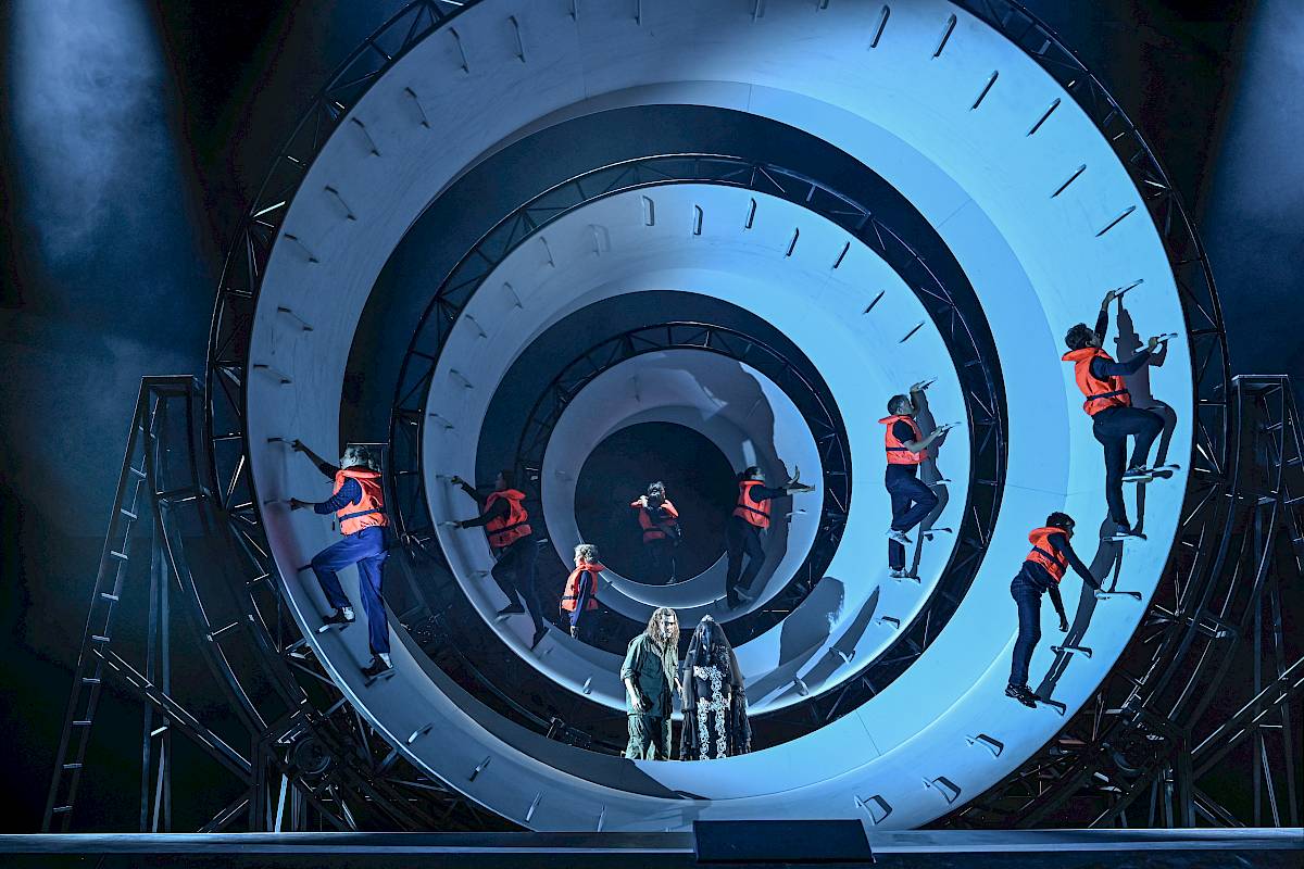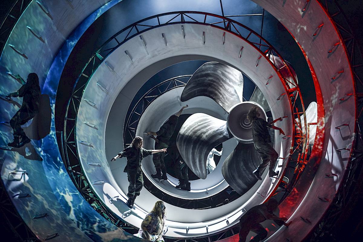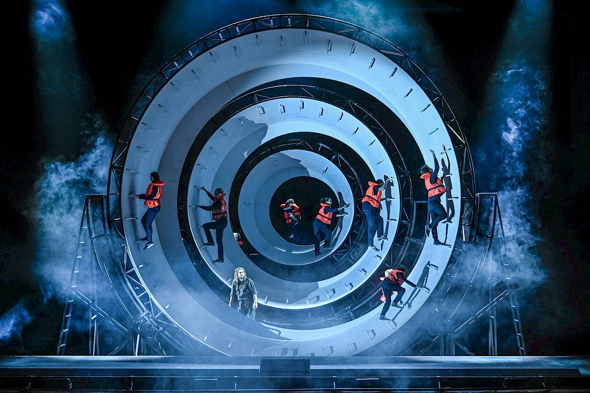 Die Werkstätten des Opernhauses – allen voran die Schlosserei – haben entsprechend der Vorgabe des Bühnenbildners David Hohmann das Seeungeheuer Charybdis aus der griechischen Mythologie wahrhaftig auf die Bühne gestellt. Der Mythologie nach sog Charybdis dreimal am Tag das Meerwasser ein, und es bildete sich ein gigantischer, für Seefahrende äusserst gefährlicher Strudel. Ein Strudel ist in diesem Fall kein in Vanillesauce schwimmendes Gebäck, sondern ein trichterförmiger, endloser Schlund, von dem Schiffe und – in unserer Oper – einige der Gefährten des Odysseus verschlungen werden.