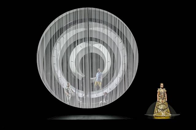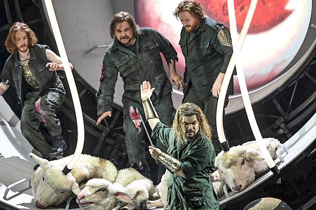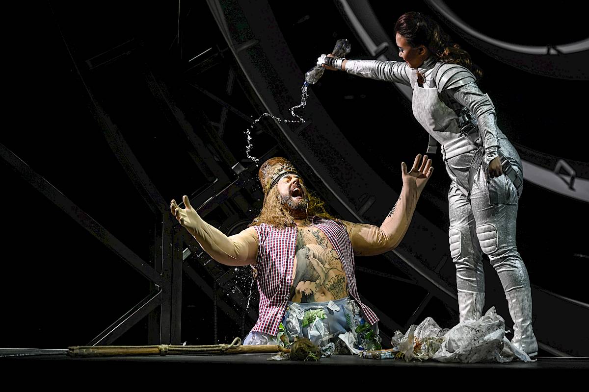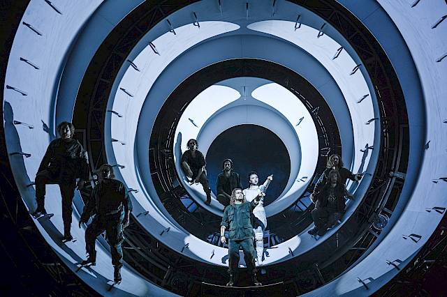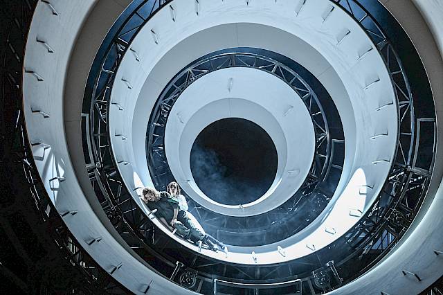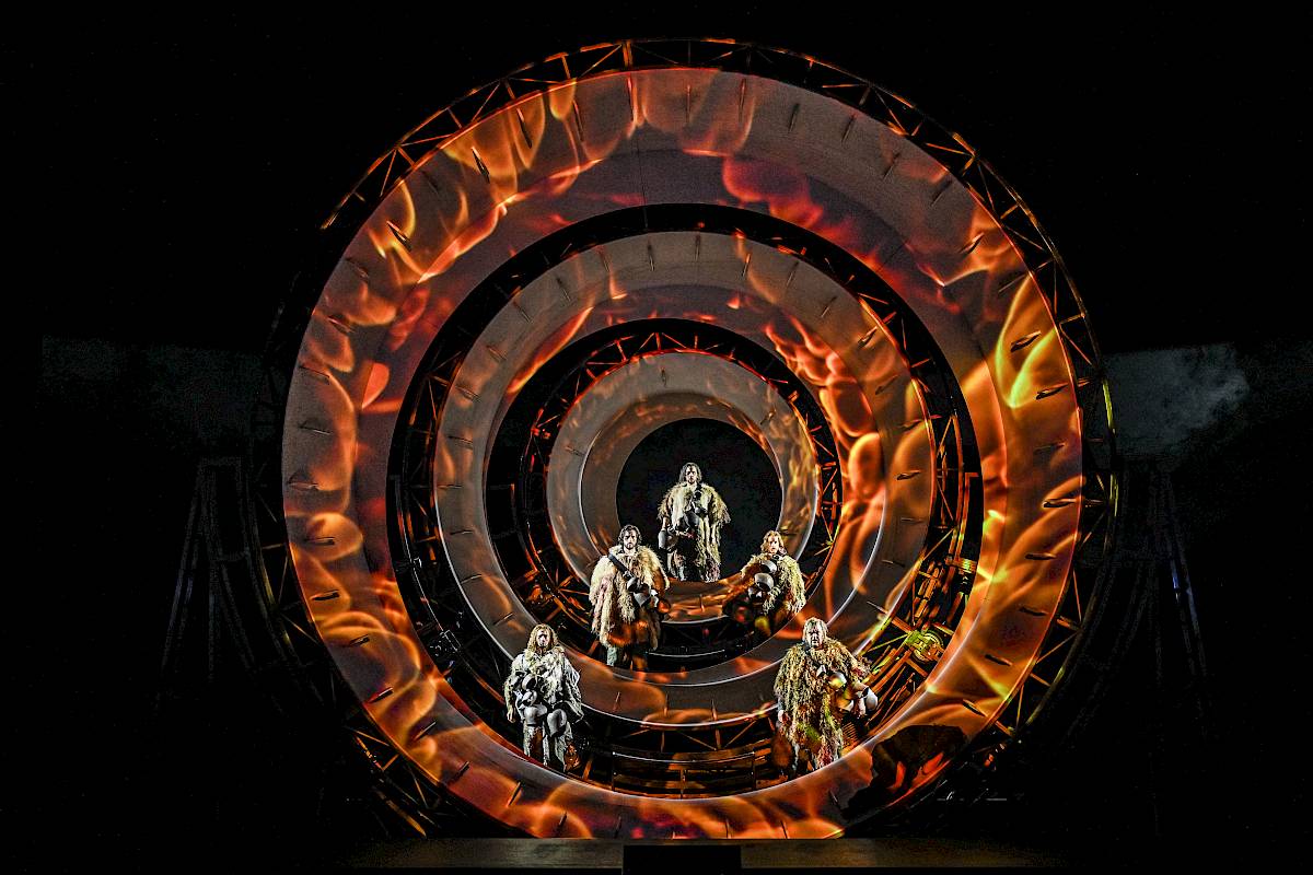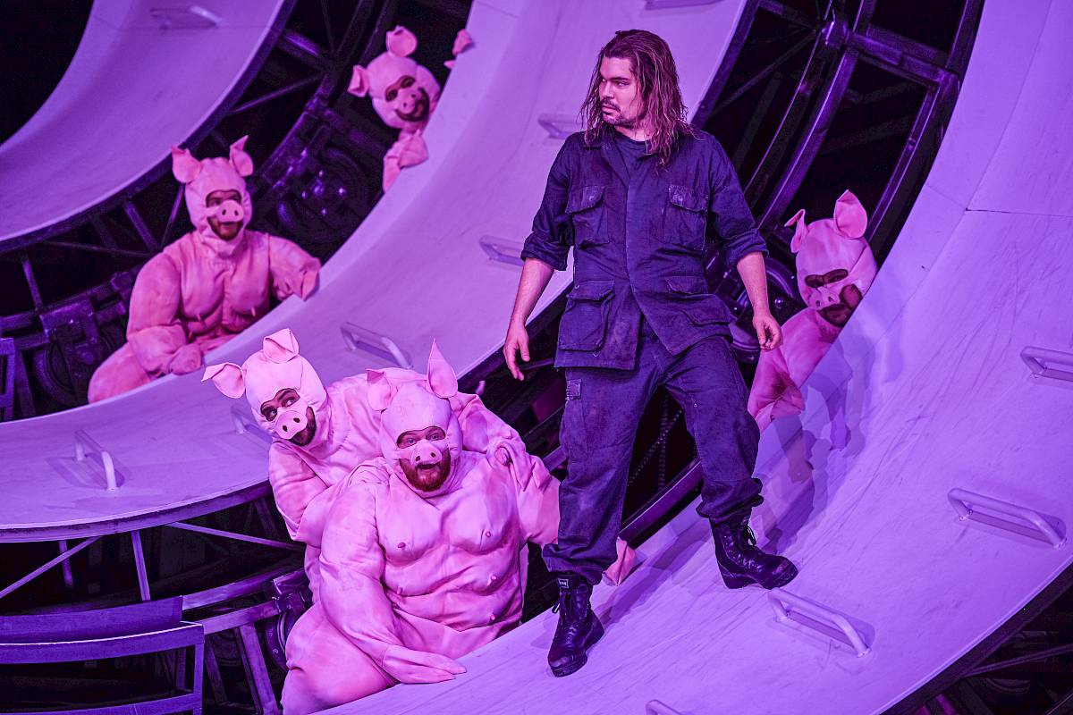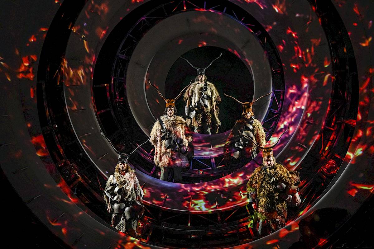 Die Werkstätten des Opernhauses – allen voran die Schlosserei – haben entsprechend der Vorgabe des Bühnenbildners David Hohmann das Seeungeheuer Charybdis aus der griechischen Mythologie wahrhaftig auf die Bühne gestellt. Der Mythologie nach sog Charybdis dreimal am Tag das Meerwasser ein, und es bildete sich ein gigantischer, für Seefahrende äusserst gefährlicher Strudel. Ein Strudel ist in diesem Fall kein in Vanillesauce schwimmendes Gebäck, sondern ein trichterförmiger, endloser Schlund, von dem Schiffe und – in unserer Oper – einige der Gefährten des Odysseus verschlungen werden.