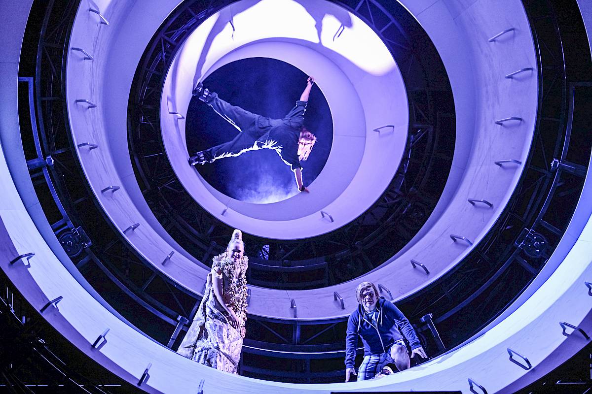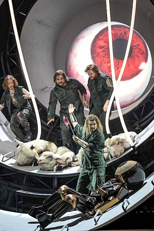 Unsere Maschinisten haben Charybdis während der Proben so dressiert, dass der Trichter auch nur sanft hin und her schaukeln kann: Und schon ist für das Publikum aus einem Strudel ein Schiff in einer sanften Dünung geworden. Aber wehe, wenn die Gefährten des Odysseus die Götter verärgern, dann wird aus der Dünung schwerer Seegang, und wenn tatsächlich Charybdis entfesselt wird, ist das wirklich sehenswert. Schauen Sie sich das an!