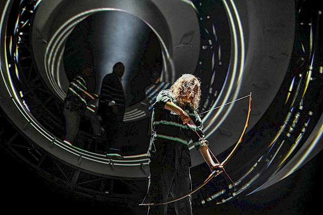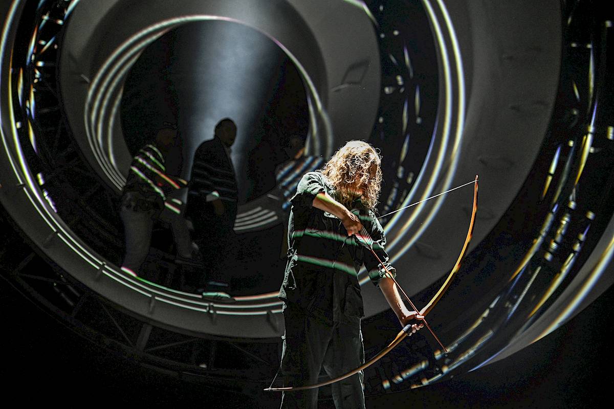 Kurzerhand hat David Hohmann den Strudel deswegen senkrecht gestellt, so dass das ganze Publikum in den sich drehenden Schlund schauen kann. Leider ist das Problem dabei, dass das Wasser das nicht mitmacht. Deswegen haben wir einen riesigen Trichter aus Stahl und Holz gebaut, der sich während der Inszenierung von Rainer Holzapfel dank toller Videoprojektionen von Tieni Burkhalter auch in die Höhle des einäugigen Riesen Polyphem oder die Unterwelt verwandeln kann. Und diesen Trichter können wir nun drehen lassen. Wie im echten Strudel dreht sich dann alles mit und so steht beispielsweise Odysseus im Stück plötzlich auf dem Kopf. Da so ein riesiger Strudel sich zur Mitte hin immer schneller dreht, besteht unser Trichter aus drei Teilen, die wir unterschiedlich schnell und in beide Richtungen drehen können. Die einzelnen Trichterteile stehen je auf einem Stahlgerüst aus Rollen. Diese Rollen treiben wir mit sehr kräftigen Motoren an, und dadurch dreht sich das jeweilige Trichterteil mit.