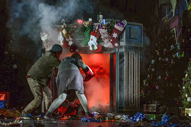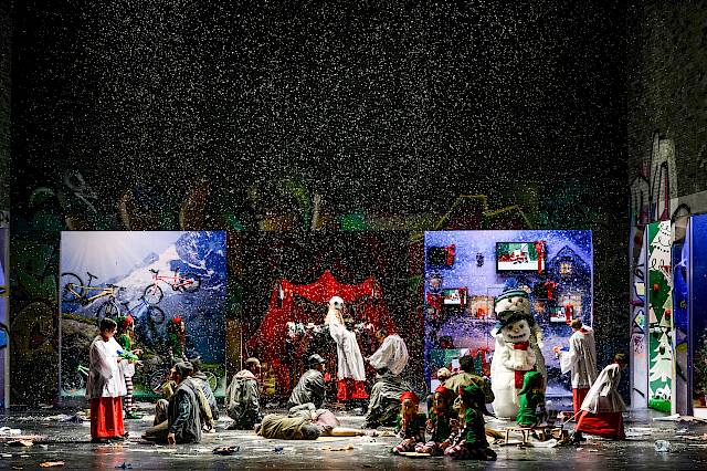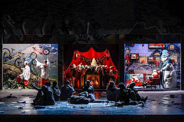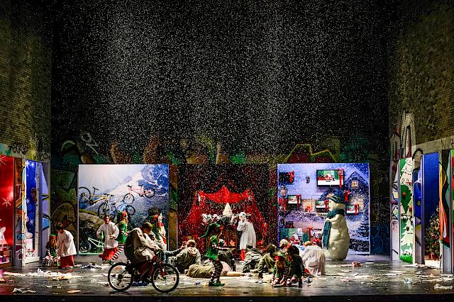 Am Knusperhäuschen der Hexe finden die Kinder eine Welt vor, die genau dem Gegenteil dessen entspricht, das sie von zuhause kennen: Die leckersten Süssigkeiten sind hier in allem Überfluss vorhanden. Eine wichtige Referenz für unsere Inszenierung sind in diesem Zusammenhang das Weihnachtsfest und vor allem der ganze kommerzielle Rummel, der heute um dieses Fest herum betrieben wird. Humperdincks Hänsel und Gretel wird ohnehin oft mit Weihnachten in Verbindung gebracht und steht häufig zur Weihnachtszeit auf den Spielplänen. Ich denke, das hat damit zu tun, dass man sich in dieser Zeit besonders viele Gedanken über Armut und Reichtum macht – für die einen ist es ein Fest des Konsums, für andere ein sehr trauriger und einsamer Anlass. Hänsel und Gretel geraten in dieser Szene vom einen Extrem ins andere.