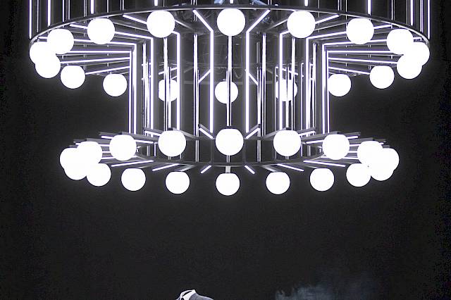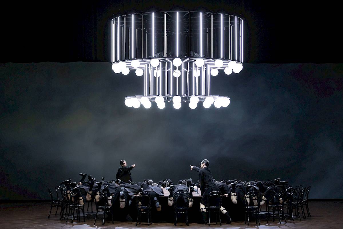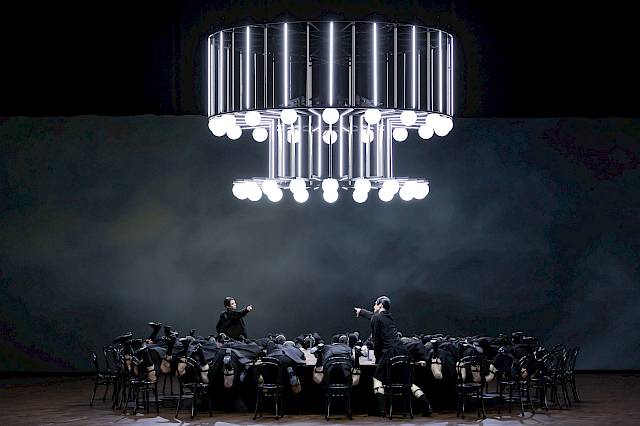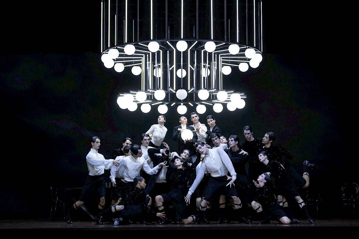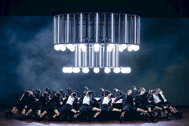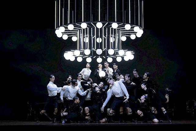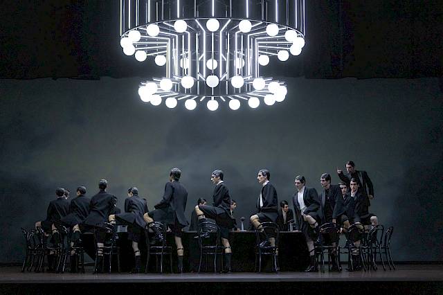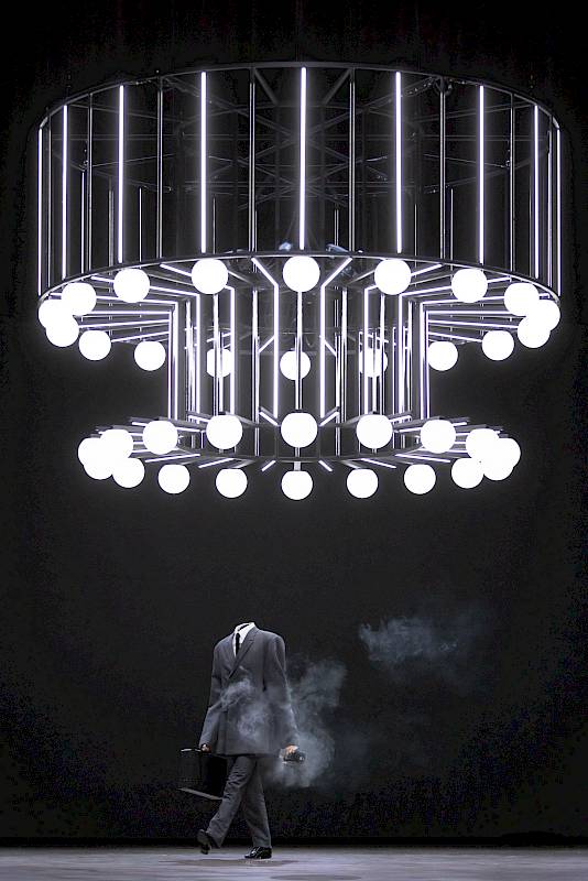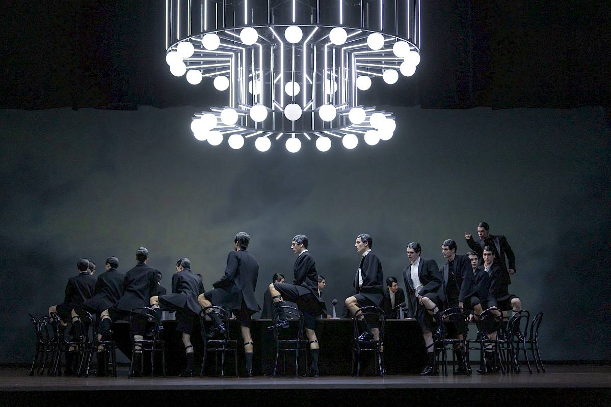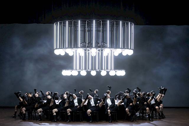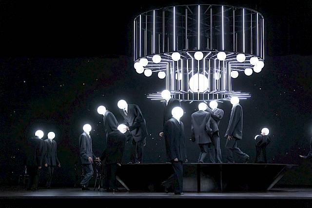 Besonders wichtig war dem Choreografen Marcos Morau von Anfang an, dass die Tänzer einfache Holzstühle über den Boden gleiten lassen können: Einmal kräftig angeschoben, sollen sie am besten von einer Seite der Bühne auf die andere rutschen. Das geht auf dem klassischen Tanzteppich aber nicht, den wir für unsere Ballette ausnahmslos legen – da rutscht nichts. Ausserdem wünschte sich der Bühnenbilder Max Glaenzel ein Parkett als Boden. Unsere Lösung für dieses doppelte Problem war eine Oberfläche aus Kunstharzlaminat, kombiniert mit nahezu unsichtbaren Filzsocken für die Füsse der Stühle. Auf das Kunstharzlaminat wurde das Foto einer Holzoberfläche aufgedruckt. Der Bühnenbildner suchte drei verschiedene Farbtöne aus. Um aus diesen Platten ein Parkett zu machen, liessen wir sie in 7.000 Streifen schneiden, mischten sie und klebten die Streifen danach passgenau als Parkett auf Holzplatten. Durch die Durchmischung der verschiedenen Holzfarben wirkt der Boden sehr natürlich. Auf diesem Boden steht ein riesiger Tisch – so gross (und schwer), dass darauf das ganze Ensemble tanzen kann. Über dem Tisch erscheint aus dem Schnürboden im Verlauf der Vorstellung ein riesiger Kronleuchter, an dem leuchtende Kugeln hängen, während auf der Tanzfläche kopflose Gestalten im Anzug durch die Gegend irren. Diese klettern auf den Tisch, nehmen die Kugeln vom Leuchter und setzen sie sich als Köpfe auf. Das sieht spektakulär aus und enthält eine Menge kniffliger Lösungen: Zunächst schuf die Kostümabteilung Anzüge, in denen die Köpfe der Tänzerinnen und Tänzer unterhalb der Kragen enden. Das sieht wirklich lustig aus, erforderte aber einen ausgesteiften Aufbau des Kragens und der ganzen Schulterregion aus einem sehr dünnen, aber stabil zusammengeschweissten Drahtgestell. Die Kunststoffschale für die Kugellampe konnten wir zum Glück direkt kaufen, das Innenleben mussten wir erfinden und einbauen: Leistungsstarke LED, dazu Akkus und eine WLAN-Steuerung. Nun können die Lichtkugeln vom Lichtpult aus gesteuert werden. Um diese Kugeln unter den Leuchter zu hängen, entwickelten wir einen Verschluss, der, egal wie die Kugel gedreht ist, einrastet und auch bei Stössen gegen den Leuchter hält. Die Kugeln hängen schliesslich lange Zeit in fünfzehn Meter Höhe über der Bühne und dürfen auf keinen Fall herabfallen – auch wenn beim Auf- und Abbauen mal ein anderes Dekorationsteil dagegen stösst. Zum Aufsetzen der Kugeln auf den Kopf ist dieser Verschluss aber nicht geeignet. Dass die Tänzer:innen den eigenen Lichtkopf beim Aufsetzen nicht sehen, erschwert die Sache zusätzlich. Eine einfache Lösung musste her: Im Kragen eingebaute Magnete halten die Kugel auf Position und erlauben das Tanzen. Jetzt fehlt mir der Platz für die weiteren Tricks der Produktion: Rotierende Überwachungskameras, die aus dem Lüster herausfahren, von der Ballett-Compagnie geführte Schafspuppen, Spiegelwände, auf der Bühne herumfahrende und trotzdem spielbare Konzertflügel, Stuhlberge und Projektionen... Nachtträume ist spektakulär!